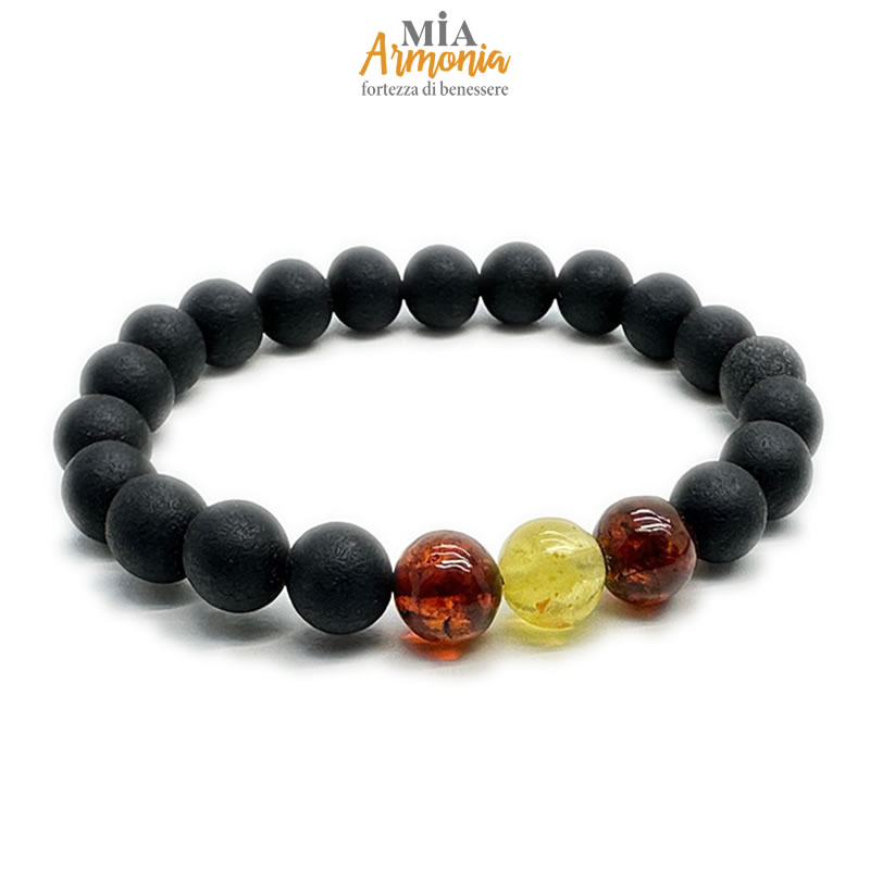 Bracciale elastico ambra nera unisex con tre inserti ambra lucida